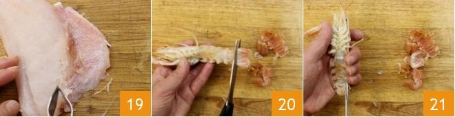 Entfernen Sie die Gräten aus den Filets mit Hilfe einer Pinzette 19. Reinigen Sie schließlich die Langusten. Mit einer Schere entfernen Sie den Schwanz 20, die Beine 21