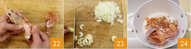 und den Panzer 22, wobei Sie den Kopf intakt lassen und alle Abfälle aufbewahren. Nachdem Sie die Zwiebel geschält haben, hacken Sie diese und den Sellerie, dann zerkleinern Sie die Knoblauchzehe 23. In einem Topf bei mäßiger Hitze geben Sie dann alle Abfälle: die Gräte des Seeteufels, Schwanz und Flossen des Drachenkopfs, Schwanz, Beine und Panzer der Langusten 24.