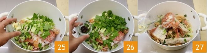 Fügen Sie die gehackte Zwiebel, Sellerie und Knoblauch hinzu 25, anschließend die ganzen Pfefferkörner 26 und lassen Sie dann mit dem Weißwein ablöschen 27.