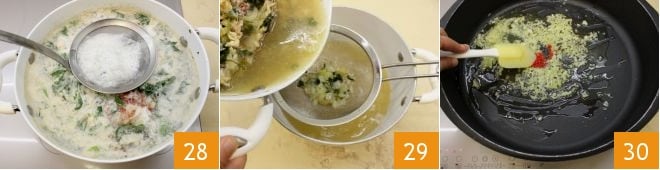 Fügen Sie das Wasser hinzu und lassen Sie es zum Kochen kommen, dann reduzieren Sie die Hitze und lassen Sie es 40-50 Minuten köcheln: Wenn nötig, entfernen Sie mit einem Schaumlöffel den Schaum an der Oberfläche 28. Sobald der Sud fertig ist, abseihen und filtern 29 und beiseite stellen. Fahren Sie mit dem Cacciucco fort. Hacken Sie fein Zwiebel, Knoblauch und Chili und braten Sie sie in einem großen Topf mit Olivenöl an 30.