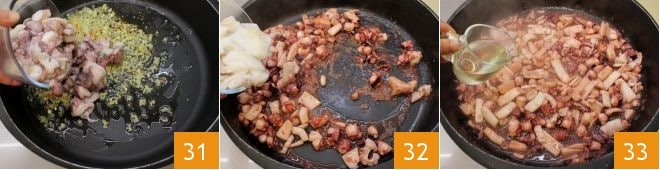 Fügen Sie den zerkleinerten Tintenfisch hinzu und lassen Sie ihn 10 Minuten kochen 31, dann fügen Sie auch die Kalmare und die Sepien hinzu 32 und lassen Sie es weitere 5 Minuten kochen. Löschen Sie mit dem Weißwein ab 33.