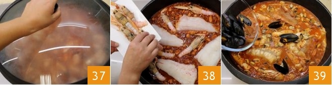 Decken Sie den Topf mit einem Deckel ab 37 und lassen Sie ihn bei niedriger Hitze 1 Stunde und 10 Minuten lang kochen. Wenn der Fisch fast gar ist, fügen Sie vorsichtig die Filets von Seeteufel und Drachenkopf hinzu und geben die Langusten dazu 38. Lassen Sie es noch 10 Minuten kochen, indem Sie weitere 500 ml hinzufügen und den Deckel auf dem Topf halten. Nach dieser Zeit fügen Sie die geschälten und die ganzen Muscheln hinzu 39 und kochen Sie für die letzten 10 Minuten).