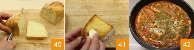 In der Zwischenzeit schneiden Sie das Brot 40 und lassen es einige Minuten im Grillmodus des Ofens rösten, für 5 Minuten. Sobald es fertig ist, reiben Sie auf jede Scheibe eine Knoblauchzehe 42 und fügen schließlich die gehackte Petersilie zum Cacciucco hinzu. Der Cacciucco alla Livornese ist fertig 43 und wird heiß mit dem gerösteten Brot serviert.