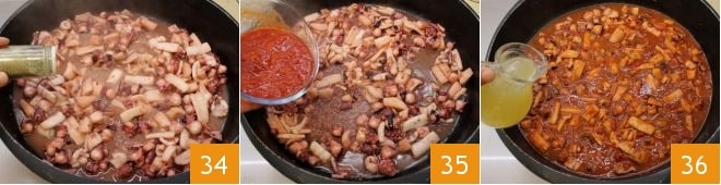 Mit Salz und Pfeffer abschmecken 34, dann die zuvor zerdrückten Tomaten hinzufügen 35 und 250 ml der gewonnenen Fischabfällebrühe 36.