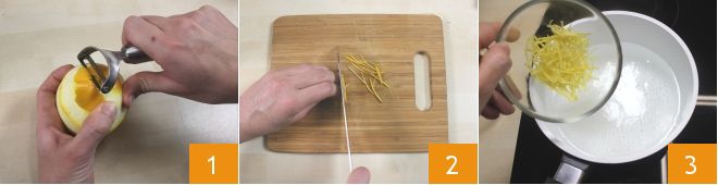 Um den Orangenkaffee mit Milchluft zuzubereiten, beginnen Sie mit der Herstellung des Orangensirups: Mit Hilfe eines Sparschälers oder eines scharfen Messers entfernen Sie die Schale der Orange 1 und schneiden Sie sie in feine Streifen 2. Blanchieren Sie die Schale in kochendem Wasser 3 Mal, wobei Sie jedes Mal das Wasser wechseln 3.
