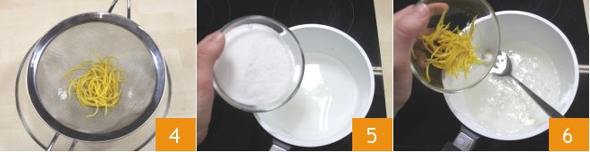 Abtropfen Sie die Orangenschale gut ab und legen Sie sie beiseite 4. In der Zwischenzeit erhitzen Sie in einem Topf 140 ml Wasser, fügen Sie den Zucker hinzu 5, lassen Sie ihn gut schmelzen und bringen Sie ihn zum Kochen (alles bei niedriger Hitze, häufig umrühren, um das Verbrennen des Zuckers zu vermeiden). Sobald es kocht, fügen Sie die Schale zum Sirup hinzu und kochen Sie weitere 5 Minuten 6. Nach der angegebenen Zeit nehmen Sie den Topf vom Herd, gießen Sie den Sirup mit der Schale in eine Schüssel und lassen Sie ihn abkühlen, bis er Raumtemperatur erreicht.