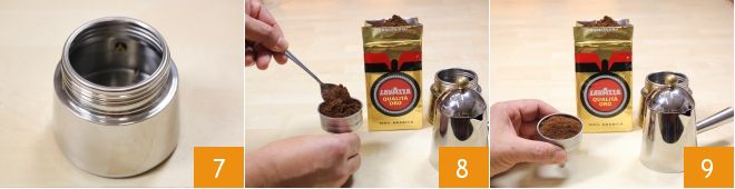 Bereiten Sie jetzt den Kaffee mit einer Kaffeekanne zu. Um einen ausgezeichneten Kaffee zu erhalten, füllen Sie den Kessel Ihrer Kaffeekanne mit kaltem Wasser, das möglichst kalkarm ist, und achten Sie darauf, nicht über das Sicherheitsventil zu füllen 7 (sonst erhalten Sie einen längeren Kaffee). Füllen Sie den Filter mit dem gemahlenen Kaffee und formen Sie einen kleinen Hügel 8, den Sie durch ein leichtes Klopfen des Filters auf den Tisch glätten 9. Drücken Sie nicht mit dem Löffel und machen Sie keine Löcher in die Oberfläche.