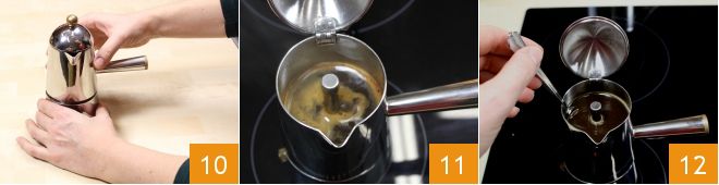 Schrauben Sie die Kaffeekanne gut zu 10 (um zu vermeiden, dass der Kaffee an den Seiten herausläuft, während er hochsteigt), und stellen Sie sie dann auf eine niedrige und konstante Flamme, um einen kräftigen Kaffee zu erhalten. Während der Kaffee hochsteigt, bildet sich ein dichter Schaum 11; wir empfehlen, den Kaffee nicht zu lange köcheln zu lassen, um Aroma und Süße zu bewahren. Ihr Kaffee ist fertig: Vor dem Eingießen rühren Sie ihn direkt in der Moka mit einem Löffel um, um ihn homogener zu machen 12.