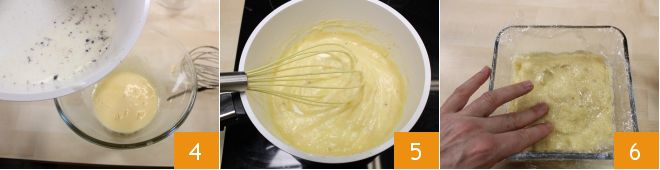 gießen Sie die erhitzte Milch nach und nach über die Mischung 4 und vermengen Sie sie mit einem Schneebesen. Stellen Sie die Mischung zurück auf den Herd und rühren Sie kontinuierlich, bis die Creme eingedickt ist 5. Geben Sie die Konditorcreme in eine Schüssel und lassen Sie sie abkühlen, indem Sie sie mit einer Frischhaltefolie abdecken 6.