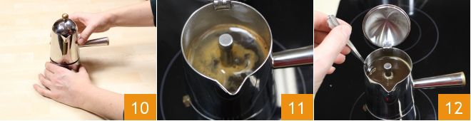 Schließen Sie die Kaffeemaschine sehr fest 10, damit der Kaffee nicht an den Seiten herausläuft, während er hochsteigt, und stellen Sie sie bei niedriger und konstanter Flamme auf den Herd, um einen kräftigen Kaffee zu erhalten. Während der Kaffee steigt, bildet sich eine dichte Schaumkrone 11: Wir empfehlen, den Kaffee nicht zu lange köcheln zu lassen, um seine Süße und sein Aroma zu bewahren. Ihr Kaffee ist fertig: Bevor Sie ihn verwenden, rühren Sie ihn direkt in der Moka mit einem Löffel um, um den Kaffee homogener zu machen 12.