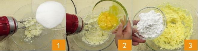 Um den Kuchen mit tausend Streifen zuzubereiten, trennen Sie zunächst die Eier in zwei verschiedene Schüsseln. Geben Sie dann die weiche Butter in eine weitere Schüssel, fügen Sie den Zucker hinzu 1 und schlagen Sie die Zutaten mit einem Handmixer, bis eine cremige Konsistenz erreicht ist. Fügen Sie unter Rühren nacheinander die Eigelbe hinzu 2 und arbeiten Sie weiter, bis eine glatte Masse entsteht. Fügen Sie nun die Maisstärke hinzu 3