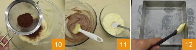 und fügen Sie dem einen Teil das gesiebte Kakaopulver hinzu 10. Die beiden Massen sind bereit 11, Sie können mit dem Backen beginnen. Legen Sie auf ein mit Backpapier bedecktes Backblech eine quadratische Form ohne Boden von 20x20 cm, die Sie an den Seiten mit einem Pinsel einfetten 12.