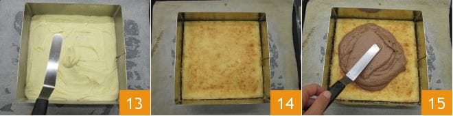 Gießen Sie die Hälfte der weißen Masse auf den Boden der Form, verteilen Sie sie gleichmäßig, sodass sie die gesamte Oberfläche bedeckt 13 und backen Sie sie 3-4 Minuten lang im vorgeheizten Ofen im Grillmodus bei 240 Grad. Wenn die Oberfläche gut gebräunt ist und sich eine dünne Kruste gebildet hat, nehmen Sie sie aus dem Ofen 14 und gießen Sie die Hälfte der Kakaomasse darüber 15