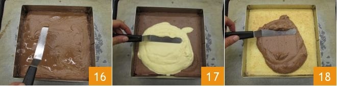 Verteilen Sie sie mit einem Spatel 16 und backen Sie sie erneut im gleichen Modus und für die gleiche Zeit. Fahren Sie dann mit der zweiten Schicht der weißen Masse fort 17, backen Sie erneut 3-4 Minuten bei 240° und beenden Sie mit der zweiten Schicht der dunklen Masse 18. Schalten Sie dieses Mal den Ofen in den statischen Modus und senken Sie die Temperatur auf 180° für 15 Minuten.