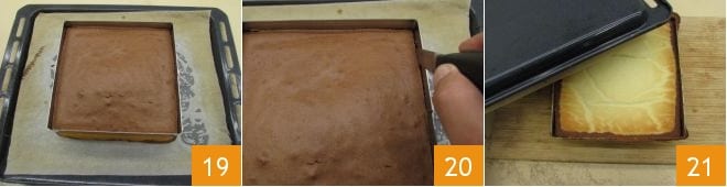 Nach Ablauf der Backzeit nehmen Sie den Kuchen aus dem Ofen 19, lassen Sie ihn abkühlen und um die Form leichter zu entfernen, ziehen Sie ein kleines Messer am inneren Rand entlang 20. Stürzen Sie den Kuchen auf ein Schneidebrett 21 und lassen Sie ihn vollständig abkühlen.