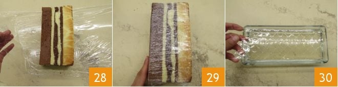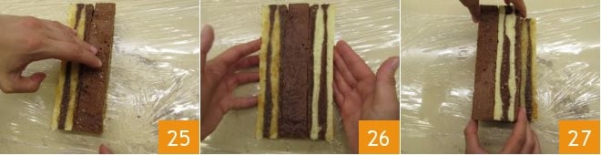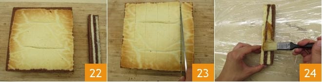 Gleichen Sie die Ränder mit einem Messer aus 22 und teilen Sie den Kuchen in sechs gleich große Teile, indem Sie Streifen 23 schneiden, verwenden Sie ein Lineal, um so präzise wie möglich zu sein. Nachdem Sie die Streifen geschnitten haben, montieren Sie sie wie folgt: Legen Sie ein Blatt Frischhaltefolie auf die Arbeitsfläche, platzieren Sie einen ersten Streifen mit der Streifenseite nach oben, dann bestreichen Sie die Oberfläche und die rechte Seite mit Aprikosenmarmelade, um die anderen Streifen zu befestigen 24