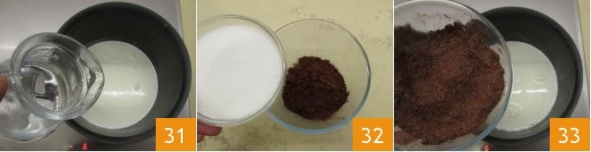 geben Sie die Sahne und das Wasser in einen Topf 31, mixen Sie separat den Zucker mit dem Kakao 32 und geben Sie alles in den Topf 33, bringen Sie es zum Kochen und lassen Sie es bei mittlerer Hitze eindicken, bis