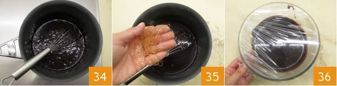 die Glasur eine Konsistenz annimmt 34. Nehmen Sie den Topf vom Herd und fügen Sie die gut abgetropfte Gelatine hinzu 35. Gut verrühren und dann die Glasur in eine Schüssel gießen, mit Frischhaltefolie abdecken 36, abkühlen lassen und in den Kühlschrank stellen.