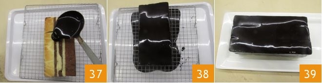 Wenn der Boden und die Glasur kalt sind, können Sie den Kuchen überziehen: Legen Sie den Kuchen auf ein Gitter, gießen Sie die Glasur mit einem Schöpflöffel darüber 37, um den Kuchen vollständig zu bedecken 38. Stellen Sie den Kuchen mindestens 20 Minuten zurück in den Kühlschrank, bevor Sie ihn servieren. Legen Sie den Kuchen auf eine Servierplatte 39 und servieren Sie ihn in Scheiben.