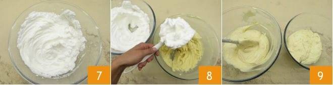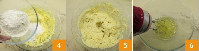 und das Mehl 4; arbeiten Sie die Mischung mit den elektrischen Schneebesen weiter, bis sie homogen ist 5. Geben Sie die Eiklar in eine Schüssel, schlagen Sie sie mit den elektrischen Schneebesen 6