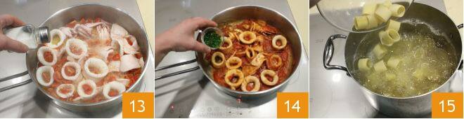 Sobald die Pasta gekocht ist, nehmen Sie eine Kelle Kochwasser und geben Sie sie in die Pfanne 16, dann seihen Sie die Calamarata ab und geben Sie sie in die Pfanne 17. Mischen Sie alles kurz und fügen Sie bei Bedarf Wasser hinzu, damit die Mischung flüssig, aber nicht getrennt bleibt 18.