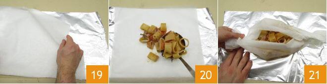 Legen Sie ein weiteres Blatt Backpapier auf ein Alufolienblatt 19, legen Sie ein paar Kellen Pasta in die Mitte 20 und schließen Sie zuerst das Backpapier zu einem Bonbon 21