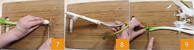 In der Zwischenzeit den Junglauch putzen: Entfernen Sie die Wurzel am unteren Ende 7; ziehen Sie die äußere Membran ab 8 und schneiden Sie auch den oberen grünen Teil ab 9, der weniger zart ist.