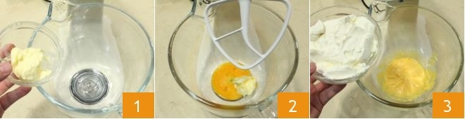 Um die süßen Aprikosenknödel zuzubereiten, weichen Sie die Butter auf und geben sie in die Schüssel einer Küchenmaschine mit Flachrührer 1, fügen Sie die Eigelbe 2 und das Salz hinzu und schalten Sie die Maschine ein, bis die Masse hell wird. Fügen Sie dann auch den Frischkäse hinzu 3 und schlagen Sie die Mischung weiter auf,