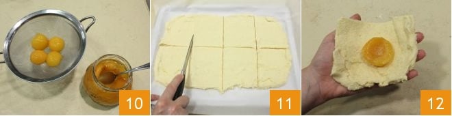 Die Aprikosen aus ihrem Sirup abtropfen lassen 10. Wenn Sie getrocknete Aprikosen verwenden, müssen Sie diese in warmem Wasser rehydrieren, dann vorsichtig ausdrücken und, falls sie einen Kern haben, diesen entfernen. Wenn es Saison ist, können Sie auch frische Aprikosen verwenden, solange sie klein sind. Wenn der Teig kalt und handhabbar ist, teilen Sie ihn in 8 gleich große Quadrate 11, nehmen Sie jeweils eine Portion und legen Sie eine halbe Aprikose in die Mitte 12