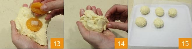 füllen Sie die Mitte mit einem halben Stück Würfelzucker und schließen Sie mit der anderen Hälfte der Aprikose 13. Umwickeln Sie die Aprikose mit dem Teig 14, formen Sie eine Kugel und verschließen Sie den Inhalt gut. Wiederholen Sie dies mit den restlichen Zutaten, bis Sie 8 Kugeln haben, die Sie auf ein Blatt Backpapier legen 15, mit Frischhaltefolie abdecken und für eine halbe Stunde in den Kühlschrank stellen.