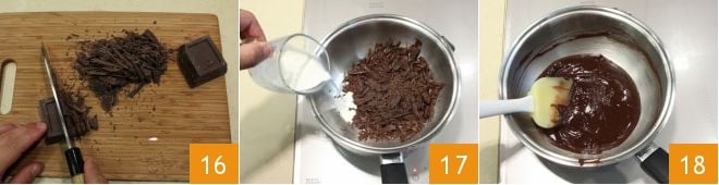 In der Zwischenzeit können Sie die Schokoladensauce zubereiten. Hacken Sie die Zartbitterschokolade 16 und lassen Sie sie in einem Wasserbad (oder in der Mikrowelle) schmelzen. Wenn sie geschmolzen ist, geben Sie die heiße Sahne hinzu 17 und rühren Sie, bis Sie eine dicke Creme erhalten 18, die Sie beiseite stellen.