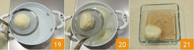 Wenn die Knödel gut gekühlt und fest sind, kochen Sie sie (jeweils 4) etwa 10 Minuten lang in siedendem, gesalzenem Wasser 19, dann abtropfen lassen 20 und in einer Mischung aus Paniermehl, braunem Zucker und Zimtpulver 21 wälzen.
