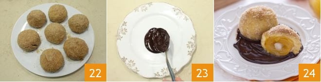 Nach und nach die panierten Knödel auf einer Servierplatte anrichten 22. Verteilen Sie die Schokoladensauce auf dem Boden eines Desserttellers 23 und legen Sie die gekochten Aprikosenknödel darauf, gewürzt nach Belieben mit zerlassener Butter 24.