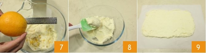 fügen Sie auch den abgeriebenen Orangenschalenabrieb hinzu 7, mischen Sie die Masse mit einem Spatel 8, dann breiten Sie die Masse auf einem Blatt Backpapier aus, sodass sie etwa eine Größe von 20 x 40 cm hat 9. Decken Sie sie mit einem weiteren Backpapierblatt ab und stellen Sie sie für etwa 1 Stunde in den Kühlschrank, um auf einem Tablett fest zu werden.