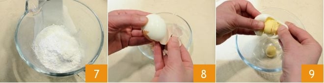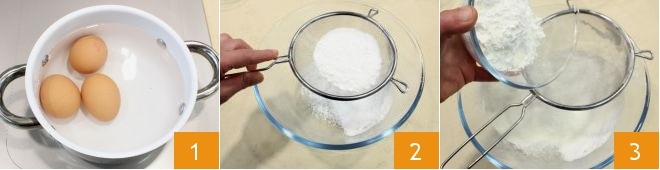Um die Canestrelli vorzubereiten, beginnen Sie damit, die Eier zu kochen, um sie hart zu machen: Es werden 8 Minuten in kochendem Wasser benötigt 1; die Eigelbe werden hart gekocht zum Teig hinzugefügt, um die richtige Mürbigkeit des Teiges zu gewährleisten. Sieben Sie in die Schüssel einer Küchenmaschine das Mehl, die Speisestärke und den Puderzucker (2-3).