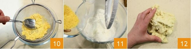 , das Sie zerdrücken und durch ein Sieb passieren können, um es cremiger und homogener zu machen 10. Dann wird es zum Rest des Teigs hinzugefügt 11. Mischen Sie die Zutaten kurz mit der Küchenmaschine 11, übertragen Sie den Teig auf eine leicht bemehlte Arbeitsfläche und formen Sie ihn schnell von Hand 12,