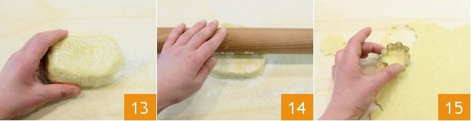 nur so lange, bis ein weicher und glatter Teig entsteht. Flachen Sie ihn leicht ab und wickeln Sie ihn in Frischhaltefolie 13 (oder legen Sie ihn in einen luftdichten Behälter) und lassen Sie ihn etwa 1 Stunde im Kühlschrank ruhen. Nach der erforderlichen Zeit rollen Sie den Teig zu einer Scheibe von 1 cm Dicke aus 14 und stechen Sie mit einem Blumenförmigen Keksausstecher von 3 cm Durchmesser die Kekse aus 15; Sie können die Reste erneut zusammenkneten. Insgesamt erhalten Sie 100 Canestrelli.