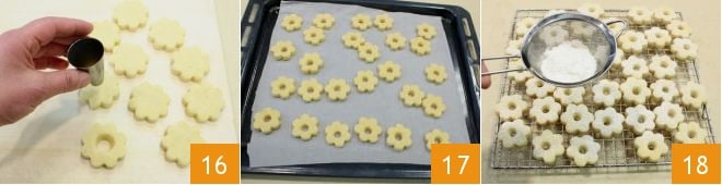 Machen Sie dann das typische zentrale Loch mit einem Ausstecher von 1 cm Durchmesser 16 (es gibt im Handel spezielle Ausstecher für Canestrelli, die das zentrale Loch direkt formen). Backen Sie wenige Canestrelli gleichzeitig, gut voneinander entfernt, auf einem mit Backpapier ausgelegten Blech 17 im vorgeheizten statischen Ofen bei 170° für 18 Minuten (Sie können auch Umluft versuchen, indem Sie eine erste Charge von wenigen Keksen bei 150° für 8-10 Minuten backen): sie sollten nicht braun werden. Sobald sie gebacken sind, nehmen Sie sie aus dem Ofen und lassen Sie sie vollständig auf einem Gitter abkühlen, dann bestäuben Sie sie mit Puderzucker 18 und servieren Sie die Canestrelli als Teegebäck oder bewahren Sie sie in kleinen Tüten auf, um sie zu einem besonderen Anlass zu verschenken.