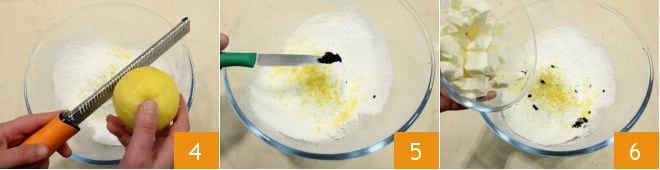 Reiben Sie dann die Schale einer unbehandelten Zitrone ab 4 und fügen Sie die Samen einer Vanilleschote hinzu 5; geben Sie auch die kalte Butter in Stücken hinzu 6