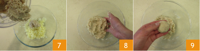 Fügt die Cannellini- und Gewürzmischung hinzu 7 und knetet einige Sekunden mit den Händen, bis ihr eine homogene und weiche Mischung erhaltet 8. Formt mit den Händen 14 kleine Bällchen von etwa 35 g jedes 9.