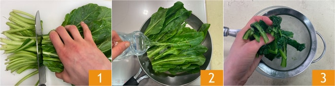Um die gefüllten Cannelloni mit Artischocken- und Wurstragout zuzubereiten, schneiden Sie zuerst die Mangoldstiele ab 1; bewahren Sie sie auf, da sie für das Ragout benötigt werden. Legen Sie die Mangoldblätter in einen Topf mit einem halben Glas Wasser 2, decken Sie sie mit einem Deckel ab und lassen Sie sie 2 Minuten lang welken. Abgießen und abkühlen lassen, dann den Mangold gut ausdrücken, um so viel Wasser wie möglich zu entfernen 3.
