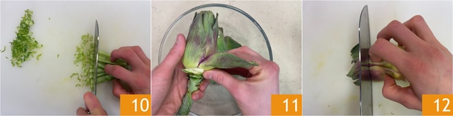 Die Mangoldstiele fein schneiden 10 und sich dann der Wie man Artischocken putzt widmen: Die äußeren, härteren Blätter entfernen 11 und die Spitzen abschneiden 12.