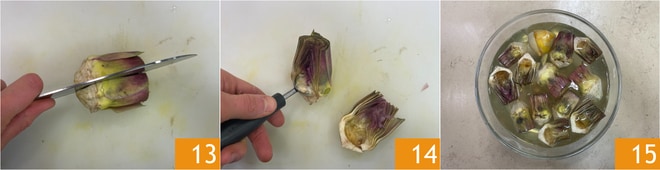 Die Artischocken halbieren 13 und das Heu entfernen 14. Beim Putzen in Zitronenwasser legen 15.