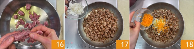 In einer Pfanne etwas Öl erhitzen, dann die Wurst zerbröseln 16 und bei mittlerer Hitze anbraten. Wenn sie anfängt, goldbraun zu werden, fügen Sie die Zwiebel 17, den Sellerie und die Karotten hinzu, die Sie zuvor fein gehackt haben 18. Etwa zwei Minuten kochen lassen.