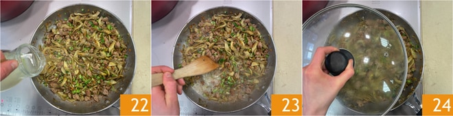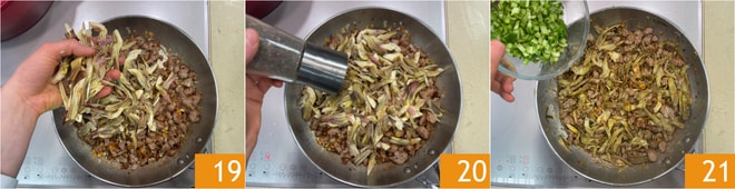 Die Artischocken in dünne Scheiben schneiden und in die Pfanne geben 19, dann salzen und pfeffern 20 und 10 Minuten kochen. Zu diesem Zeitpunkt die Mangoldstiele 21 hinzufügen und umrühren.