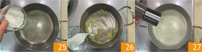 In der Zwischenzeit die Béchamelsauce zubereiten: Die Butter in einem kleinen Topf schmelzen lassen, dann das Mehl hinzufügen 25 und schnell umrühren. Wenn Sie eine blonde Mehlschwitze erhalten haben, die Milch nach und nach 26 unter ständigem Rühren hinzufügen, um Klumpen zu entfernen. Zum Kochen bringen und die Hitze ausschalten; sie sollte ziemlich flüssig sein. Mit Salz und Pfeffer abschmecken 27.