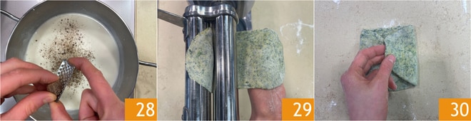 Zum Schluss mit Muskatnuss würzen 28. Den Teig wieder aufnehmen und ein Stück abschneiden; den restlichen Teig abdecken, damit er nicht austrocknet. Den Teig mit einer Nudelmaschine ausrollen, beginnend mit der größten Dicke 29 und dabei Falten machen, insbesondere während der ersten Durchgänge 30.