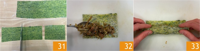 Auf diese Weise fortfahren, bis die feinste Dicke erreicht ist und der Teig aufgebraucht ist; Sie sollten etwa 1 mm dicke Blätter erhalten. Die Teigblätter in Rechtecke von 10x14 cm schneiden 31. Die Rechtecke großzügig mit der Füllung 32 füllen und aufrollen 33.