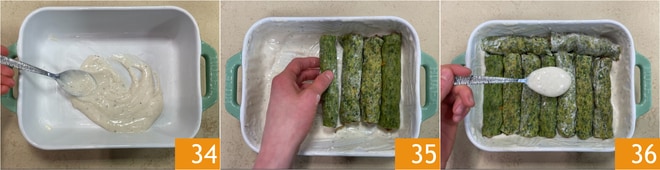 Eine Auflaufform mit Butter einfetten und etwa die Hälfte der Béchamelsauce auf den Boden gießen, auch die Ränder abdecken 34. Legen Sie die Cannelloni in die Auflaufform mit der Nahtseite nach unten 35, dann mit der restlichen Béchamelsauce 36 bedecken.