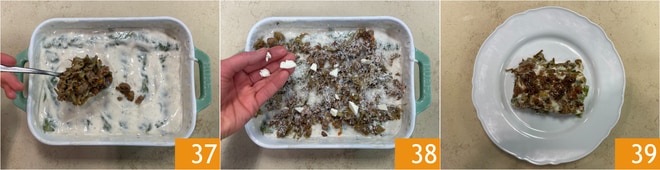 Das restliche Artischocken- und Wurstragout 37 auf der Oberfläche verteilen, dann mit geriebenem Parmesan und ein paar Butterflocken 38 abschließen. Im statischen Ofen bei 180° für 20-25 Minuten backen, bei Bedarf die letzten 2-3 Minuten im Grillmodus. Die gefüllten Cannelloni mit Artischocken- und Wurstragout sind bereit, serviert zu werden 39!